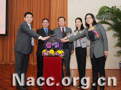 中央党校党建教部副主任戴焰军(左三)、中国人民大学农业与农村发展学院副院长郑风田(左二)、人民网副总裁陈智霞(右二)、人民网共产党新闻部主任孙海峰(右一)、永业集团总裁程坦(左一)共同启动农村基层创先争优主题案例征集活动
