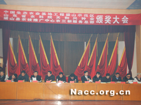 本网讯 日前,由中国生态农业千县万亩示范基地工程优选产品科技下乡活动梁山示范区,梁山县农业技术推广中心农三新服务总部、山东农科院天和兴种业联合在山东梁山政府礼堂举办2006年玉米高产擂台赛和2006年优秀示范网点颁奖大会。中国生态农业千县万亩示范基地工程优选产品科技下乡活动办公室主任辛士、梁山示范区顾问王占甲、县政府副县长宁瑞峰,县政协副主席韩相顺、梁山县农业技术推广中心农三新服务总部主任陈庆科、山东农科院天和兴种业董事长战明奎研究员等出席了会议并讲话,县工商局、县技术监督局、县农业局、县农业执法大队以及擂台赛获奖得主及科技带头户种田能手等共计400余人参加了颁奖大会。县人大副主任林英科主持了会议。