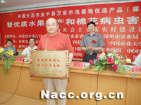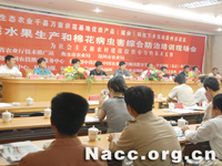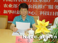 本网讯 葛玉报道 2007年6月2日,正值芒种前夕,河北省深州市牛得草大酒店彩幅高悬,热闹非凡。中国生态农业千县万亩示范基地工程优选产品(媒体)科技下乡活动(深州示范区)暨优质水果生产和棉花病虫害综合防治培训现场会在这里隆重举行。出席本次活动的领导有:农业部全国农技推广服务中心处长陈海章、中国农业大学继续教育学院院长吴加志、中农国优(北京)科技推广中心. 示范区工程办常务副主任辛士、中国农业大学齐俊生博士和礼毅教授、深州市人大副主任贺太平、深州市农业局长李宗深、副局长刘双纵、农业局执法队黄义、工商局长杨德魁、技术监督局副局长宿海涛、北京中农天诺科技发展有限公司特区副经理丁以为、河北华脉种业有限公司总经理李保存、深州市益民生产资料门市部经理石铁生等。还有新华社新闻中心、科技日报、农民日报、中国技术市场报、农产品加工、北京农业、农村大市场杂志社等宣传媒体及衡水农技推广、农资经营、乡村干部、种植大户共300余人参加了会议。