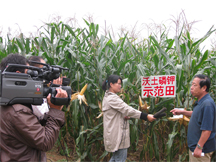 图1 菏泽电视台在使用沃土磷钾的玉米田现场采访了吴玉光研究员