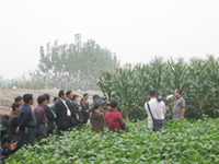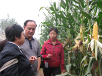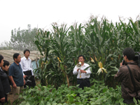 图3、4 周法永博士在现场向参观代表和记者介绍用生物技术促进玉米生长的知识