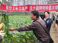 在示范田,大家看到施用沃土磷钾的玉米明显好于对照,茎杆坚韧、有弹性,不易折断;而对照地块的秸秆纤细,有点弱不禁风的样子。施用沃土磷钾的玉米叶片宽、厚、呈绿色,基本上没有大、小斑病和条纹病,其穗大、粗,没有秃尖或有很短的秃尖;而对照的玉米穗细、短、秃尖比较重,有的秃尖长达4厘米。有人估产,施用沃土磷钾的玉米产量可以达到700~750千克/亩,比对照可增产150~200千克/亩。与会代表都对沃土磷钾的作用感到新奇。吴玉光研究员一边引导大家如何观察植株的长势,如何进行比对,同时介绍了沃土磷钾的八大作用及增产原因,周博士介绍了微生物菌剂的作用。微生物菌剂的作用其实就是起动植物的新陈代谢的第二系统,它的实质就是促进化感物质的分泌。