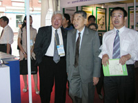 图5 科技部原副部长韩德乾和全国农业技术推广服务中心主任夏敬源在全国农业高新技术成果产品交流交易中心常务副主任辛士的陪同下参观精品展。