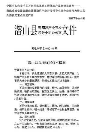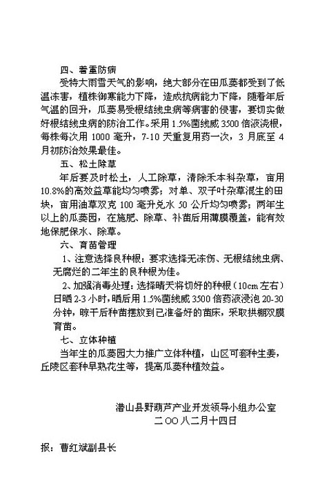 春节附近,该镇遭遇了特大雨雪灾害,瓜蒌灾情严重,御寒抗病是当前主要课题。灾情过后,为确保根结线虫病病害发生减少。根据2007年的实验结果,总结出了一套防治方法。