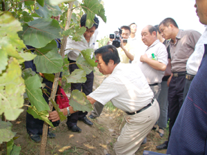 中农国优科技推广中心彩色速生杨项目部总经理刘慈新向大家详细讲解了速生彩叶杨的栽种管理方法。首先育苗地要水源、底肥充足,每亩地可上熟鸡粪4~5立方米,或使用生物肉蛋白有机肥100~150公斤,这样树苗生根快、出苗早,成活率高。其次要苗地平整,深耕细耙,打埂插扦,使用散苗胺封闭,每亩地3500~4000苗为宜。行距为宽窄行或相等行均可,宽窄行按50×70厘米,相等行按60×60厘米,株距按25~30厘米。在插扦前一天,可用微生物菌剂把种条浸泡12~20个小时,以促进生根发芽。生长期管理最重要,在5~6叶期进行第一次追施化肥,6月下旬至7月上旬,是树苗生长的关键时期,每亩地施化肥30~40公斤为宜,底肥不充足的地块,或树苗过稠的地块,在8月上旬多追一次,每亩使用尿素10~15公斤为宜。他说,彩叶杨前期树苗小,最好人工除草,不要使用除草剂,中后期可以使用适当的除草剂定向除草,在7、8月份雨水足、温度高,树苗长得快,要防止树苗出杈,不断清除杈芽。